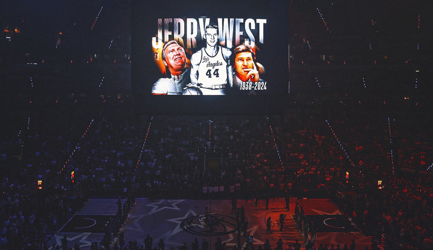 “The NBA family mourns the passing of a basketball giant, Jerry West, an NBA cornerstone for over six decades,” Breen said as images of West were displayed on the giant overhead scoreboard. “West was an All-Star every year he played and helped the Lakers to the NBA Finals nine times. Off the court, West’s brilliance continued, serving as the architect of eight championship teams. An NBA champion, he was recognized by the Hall of Fame as a player, contributor and as a member of the 1960 U.S. men’s Olympic team.