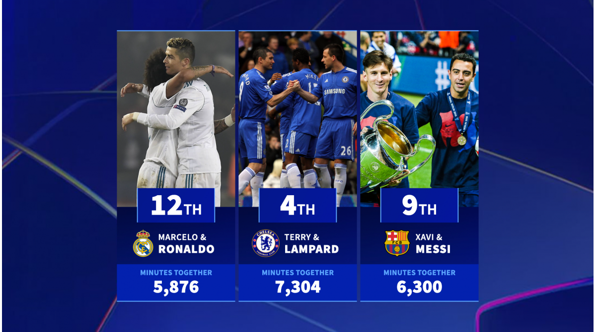 Barcelona and Real Madrid dominate the list with only two duos in the top 20 not representing the biggest two clubs in Spain. Barcelona account for seven of the top ten entries with Lionel Messi featuring five times, including top spot. The Argentinian legend and Sergio Busquets played more minutes together in the Champions League (8,261) than any other two players. Messi lifted the famous trophy four times across his illustrious career, with Busquets winning it three times and the duo are still playing together in the MLS for Inter Miami.