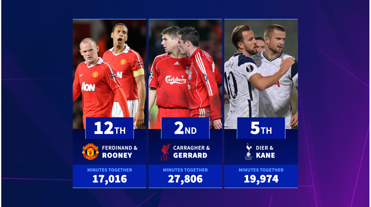 Leighton Baines and Phil Jagielka were the cornerstone of Everton’s defence for almost a decade and they rank third with 20,223 minutes. Eric Dier and Harry Kane are together again at Bayern Munich and the England internationals ranks fifth after playing 19,974 minutes together for Tottenham in the Premier League. Wayne Rooney and Michael Carrick won it all at Manchester United and they sit 8th, with both now pursuing managerial careers in the English Championship. Mo Salah features twice on the list with Liverpool full-backs Trent Alexander-Arnold and Andy Robertson with those duos still playing in the Premier League.
